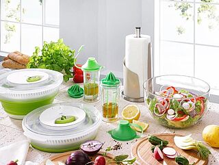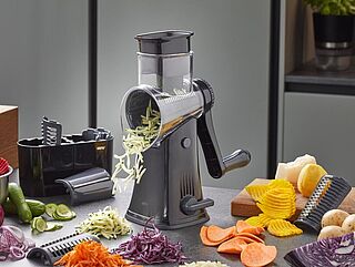 Trommelreibe Click, multifunktional für Gemüse, Obst, Käse, Schokolade, Nüsse etc. innovative Wechseltrommel, 5 verschiedene, extrascharfe Klingeneinsätze: Scheiben, gewellte Scheiben, grobe Raspel, feinen und groben Julienneschnitt, praktische Aufbewahrungsbox für die Klingeneinsätze. Inkl. Stößer zum sicheren Nachschieben, hoher Standfuß zum Unterstellen auch höherer Schüsseln, abnehmbares Gehäuse, 100 % rutschsicherer Vakuumsaugfuß, alle Teile sind spülmaschinengeeignet (ausgenommen Standfuß und Aufbewahrungsbox)
