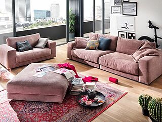 Mit dem Bigsofa Sventies SK267 liegen sie voll im Trend. Durch die besonders legere Polsterung zeichnet sich diese Garnitur aus. Mit hochwertigen Kammerkissen, einfach aufschütteln, um die Optik aufzufrischen. Wählen sie aus zwei Sitztiefen ihr individuelles Sofa. Der Cord-Bezug in rosa unterstreicht den trendigen Look. Alle Rückenteile sind im Originalstoff bezogen.