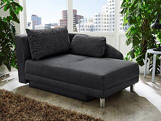 Polsterecke Mike, Stoffbezug, Metallfuß schwarz, best. aus: 2-Sitzer mit Bettfunktion und Stauraum, Armteil links und Longchair mit Armteil rechts, inkl. 5 Kissen, Stellmaß ca. 301 x 187 cm, Liegefläche ca. 212 x 132 cm. Ohne Dekoration.