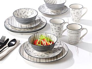 Kombiservice Sendai, aus Porzellan, spülmachinengeeignet, best aus: 4 x Dessertteller, 4 Kaffeebecher, 4 Schalen, 4 Speiseteller. Ohne Dekoration.