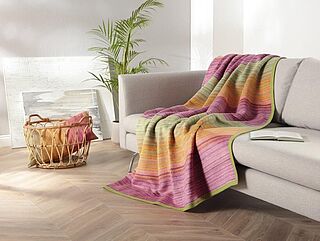 Decke, gestreift mit Einfassband, 58 % Baumwolle, 32 % Polyacryl, 10 % Polyester (Ober- und Unterseite), 30°C Schonwäsche, trochnergeeignet, 150 x 200 cm, verschiedende Farben.