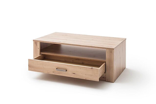 Auch funktional weiß der Wohnzimmertisch auf ganzer Linie zu überzeugen. Unter der robusten Tischplatte befinden sich ein offenes Ablagefach und eine gedämpfte Schublade, die ein angenehm leises Öffnen und Schließen ermöglicht. Die Ablage ist optimal, um beispielsweise Fernbedienungen oder die Zeitschriften, Magazine und Bücher, die Sie aktuell lesen, aufzubewahren und schnell griffbereit zu haben. Im Schubkasten können Sie licht- und staubempfindliche Gegenstände lagern. Kurzum fungiert der Sofatisch als praktisches Ablage- und Stauraummöbel.